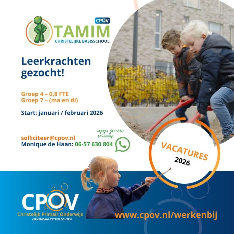 Het bestuur van Stichting CPOV is voor basisschool Tamim op zoek naar enthousiaste leerkrachten voor de middenbouw – groep 4 (0,8 fte) en de bovenbouw – groep 7(0,4 fte).